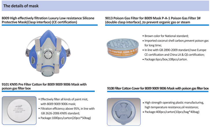 ●With two boxes of P-A-1(3#), to prevent organic gas or steam,for example,benzene and it’s homologous ,aniline, gasoline, acetone, carbon disulfide, alcohols, ether, aldehyde, carbon tetrachloride, three potassium chloride, celfume, methyl chloride, nitrobenzene,  nitroalkane, chloropicrin;