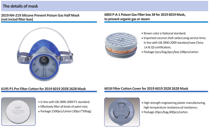●With a P-A-1(3#) Filter to prevent organic gas or steam,for example, Aniline, gasoline, acetone, carbon disulfide, alcohols, ethers, aldehydes, carbon tetrachloride, three potassium chloride, methyl chloride, nitrobenzene, chloropicrin;